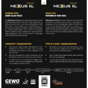 GEWO Nexxus EL Pro 43 er den perfekte kombination af maksimalt overfladegreb (DGC40+ 2.0) og al den kraft, du har brug for til den moderne spin-offensive spillestil. Den udgør den hastigheds-elastiske midte i GEWO Nexxus EL Pro-serien og viser sine styrker især i variantrige, spin-angrebssituationer.