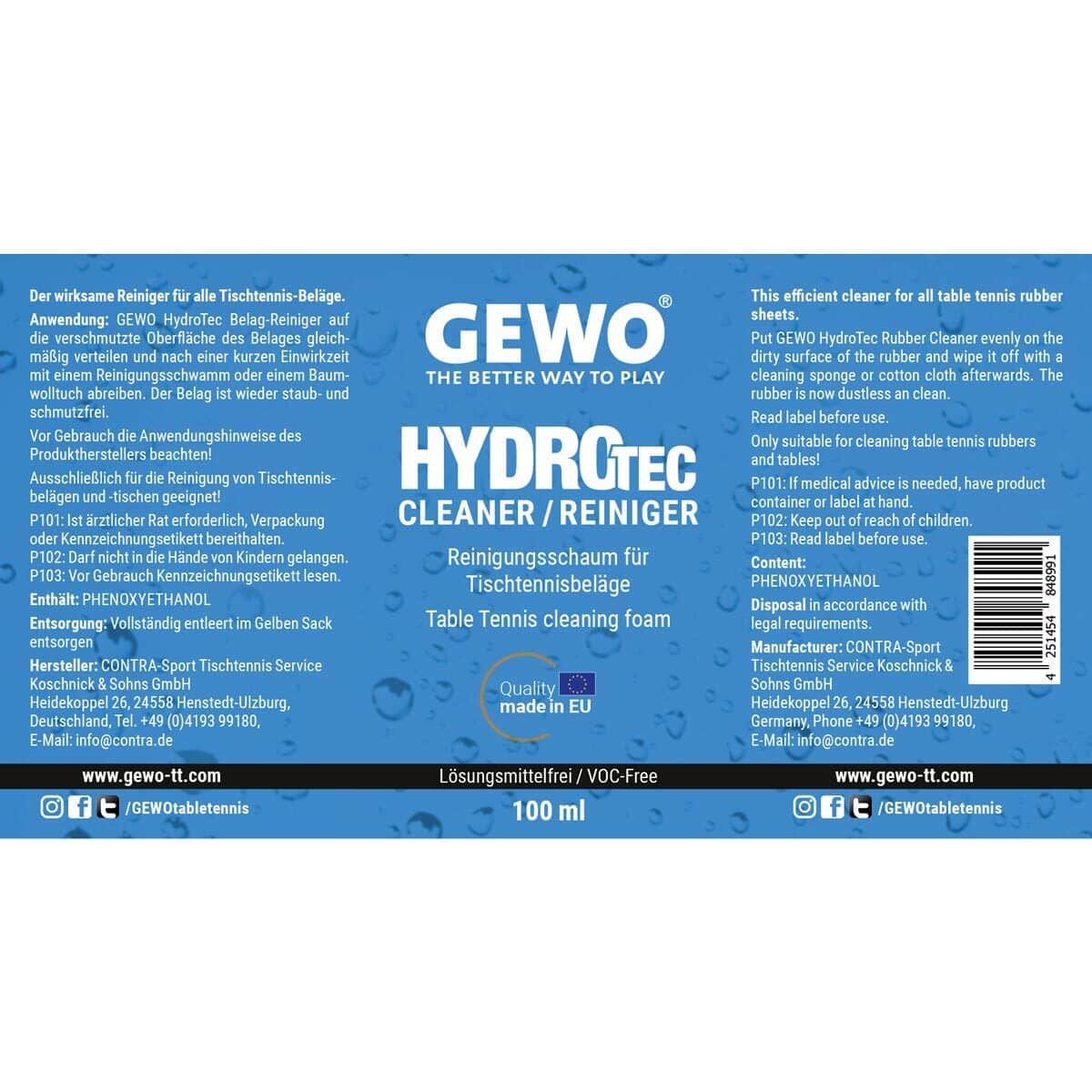 GEWO HydroTec Rense-Skum er en højkvalitets specialrens, der pålideligt fjerner støv, snavs og svedrester fra dit bordtennisbat. Regelmæssig brug bevarer spilleegenskaberne, holder overfladen gribende og forlænger belægningens holdbarhed.