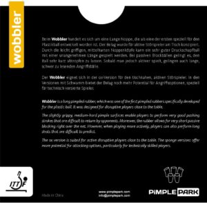 Wobbler imponerer med sin flade bane og fremkalder fejl fra modstanderen. Ved hyppigt skift mellem korte og lange slag bliver Wobbler først rigtig ubehagelig at spille imod. Modstandere kan aldrig ordentligt tilpasse sig de indkommende slag og bliver forstyrret i deres egen spillerytme.